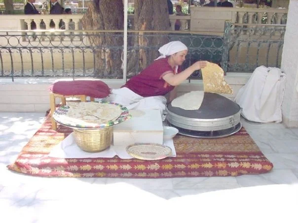 Whenever we make dough for Zaatar pies, we save some to make Arabic (pita) bread. This is a Basic Dough recipe which is used to make Spinach, Meat and other hand-shaped small pies, as well as bread. The dough is rolled thinner than for pita rounds, and is folded and sealed around a variety of fillings. This bread is present at almost every Lebanese meal. Another variety of Arabic bread that I love is rolled paper-thin and cooked on the top of a domed outdoor oven. It is called 'marqooq', and is like lavash but much thinner. It can be found at Middle Eastern or Persian markets.